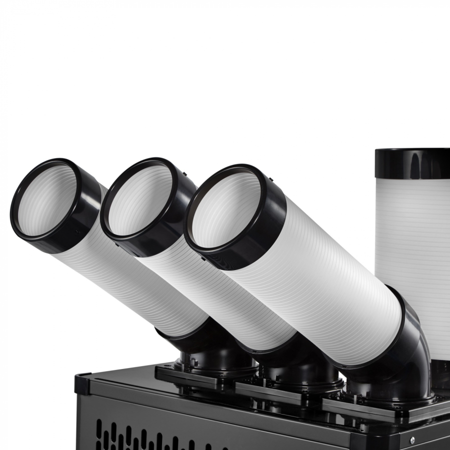 В кондиционерах реализовано 3D распределение воздушного потока благодаря гибким патрубкам выполненным из плотного ABS пластика. Каждый из них может быть доукомплектован перфорированным воздухораспределительным рукавом, длиной до 5 метров, обеспечивая полное покрытие помещения.